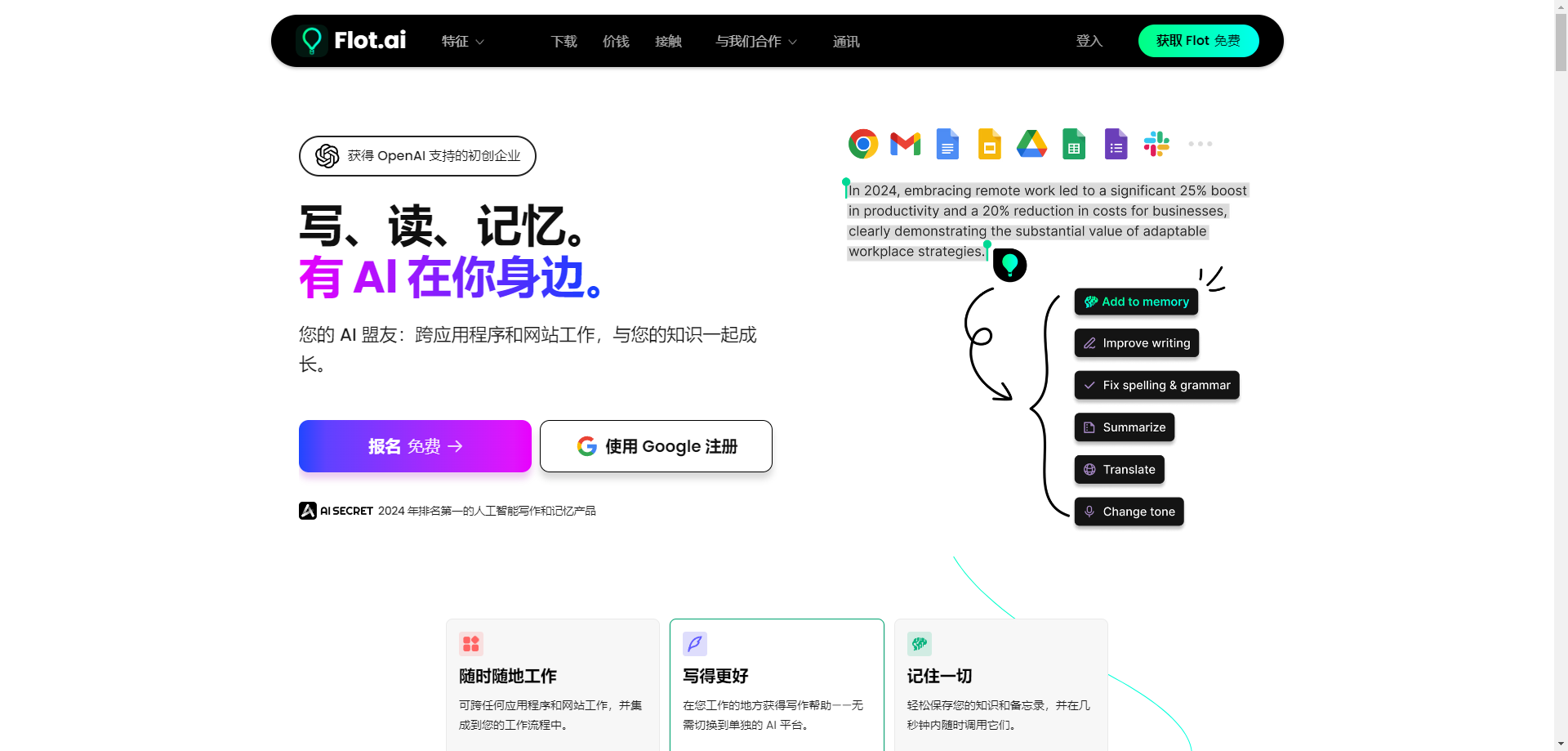 Flot.ai 是一款集成式的人工智能写作助手,它使用 GPT-4 模型并支持超过 200 种语言。这个工具可以帮助用户在各种应用或网站上获得 AI 的帮助,从而提高工作效率和效率。
